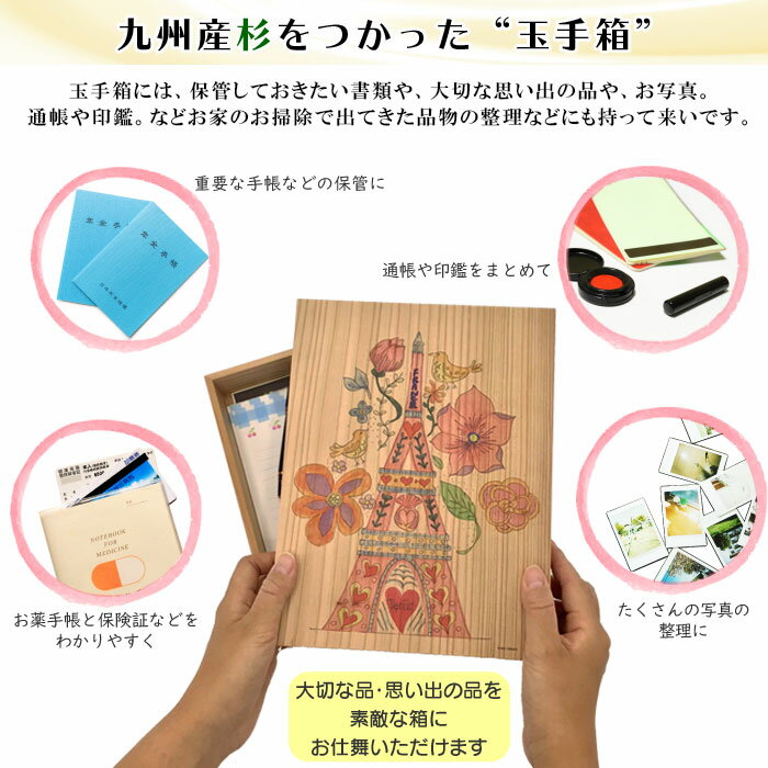 【送料無料】 国産杉 玉手箱 国産 日本製 収納 整理整頓 書類収納 木製ケース ボックス 書類ケース 木製 おしゃれ 柄プリント 小鹿 ブレーメン 花 裁縫 いちご インコ エッフェル塔 雑貨 ウッドボックス 小物収納 宝箱 アクセサリーケース