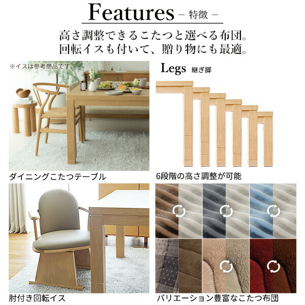 【セット構成】こたつ本体x1台/こたつ布団x1枚/肘付回転椅子x1台 【布団バリエーション】しじら織り・レンガxブラウン・ベージュxグレー 【仕様】 ■こたつ本体 天板:繊維板(転写プリント) 脚部:天然木(ラバーウッド) 薄型石英管ヒーター(500W・中間スイッチ式) コード長さ:約3m ◎一部組立(脚部取付) ■こたつ布団 [しじら]表地:綿100% 裏地:アクリル100% 中綿:ポリエステル100% [レンガ・ベージュ]表地・裏地:ポリエステル100%(はっ水フランネル) 中綿:ポリエステル100% ■回転椅子 フレーム:天然木 (アカシア) 座面:合成皮革 ◎一部組立(脚部取付) 【サイズ】 ■こたつ本体 幅90x奥行60x高さ45/50/55/60/65/70cm(継ぎ脚10cmx2個 5cmx1個)・約17kg ■こたつ布団 [しじら]250x220cm・中綿約950g [レンガ・ベージュ]252x222cm・中綿約440g ■肘付き回転椅子 幅55x奥行53x高さ74(69)cm・約10kg 株式会社ナカムラ(I-3300260)こたつ単品 >90x60 >80x80 >105x80 >135x80 >150x90 こたつ+選べるこたつ布団セット >90x60 >80x80 >105x80 >135x80 >150x90 こたつ+選べるこたつ布団+回転椅子セット >90x60 >80x80 >105x80 >135x80 >150x90 こたつ+選べるこたつ布団+肘付き回転椅子セット >90x60 >80x80 >105x80 >135x80 >150x90 こたつ掛け布団単品(しじら織り) >90x60 >80x80 >105x80 >135x80 >150x90 こたつ掛け布団単品(はっ水リバーシブル) >90x60 >80x80 >105x80 >135x80 >150x90 肘のない回転椅子 >単品 肘付き回転椅子 >単品 >組立設置サービスのご購入 >引取り(解体)サービスのご購入