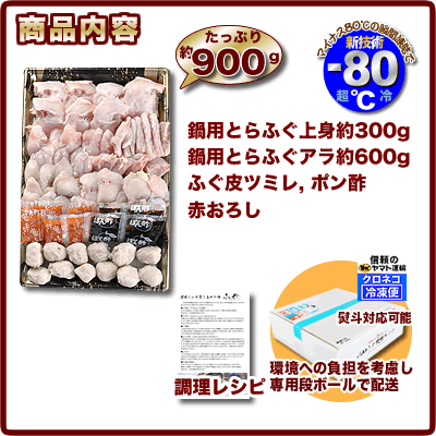 商品番号 REITO_CHIRI_5-6 商品名 “国産養殖トラふぐちりセット”(5-6人前)・冷凍 内容量 鍋用上身 約300g、鍋用アラ 約600g、ツミレ 12個、ポン酢、薬味 原材料 材料別に記載 お召し 上がり方 到着したら、なるべく早めにお召し上がりください。