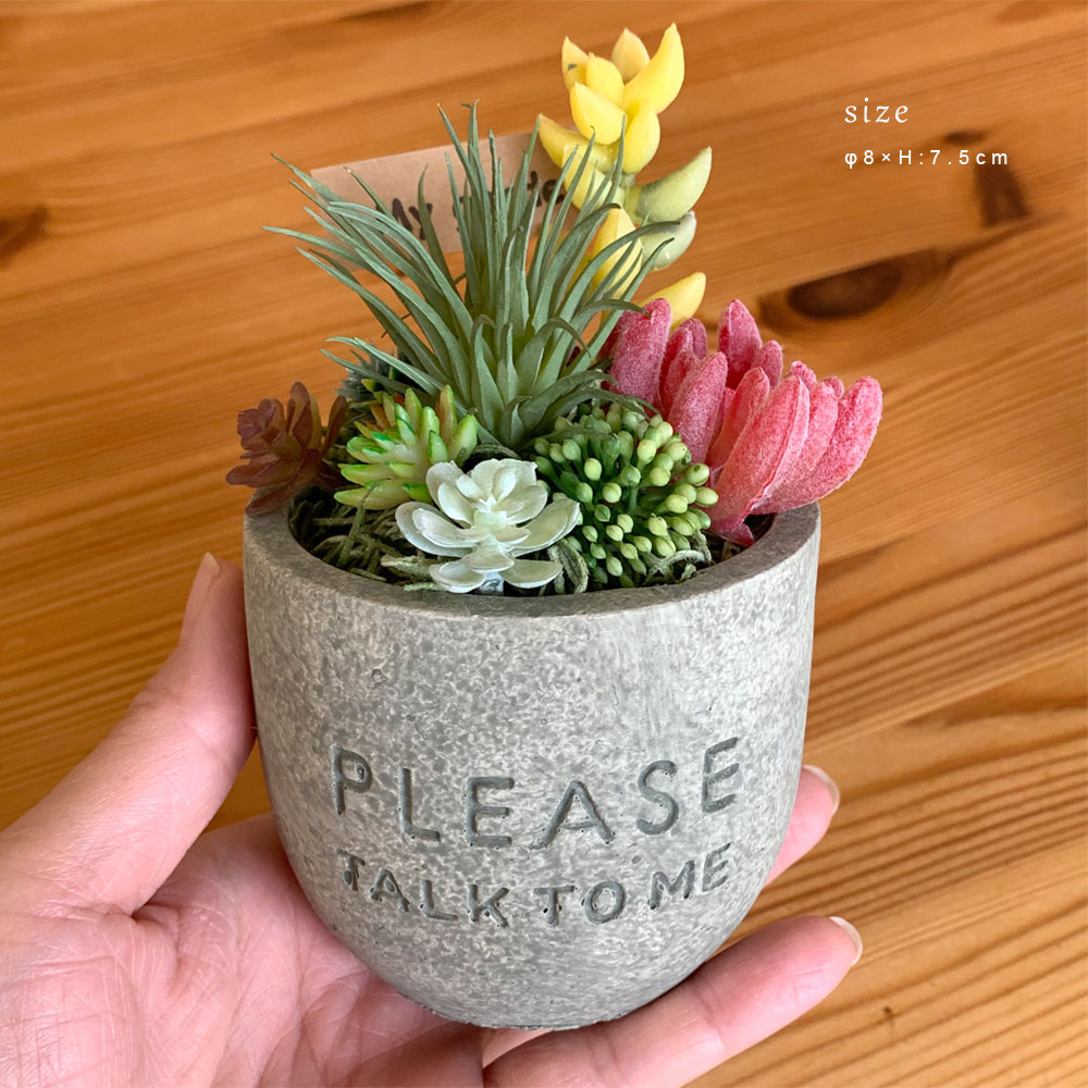 ■商品名:多肉植物アレンジ エンボス加工メッセージデザインポット ■サイズ:φ8cm、深さ:7.5cm ■花材:フェイクの多肉植物 ※ご注文をいただいてから、一つひとつ心を込めてお作りしております。