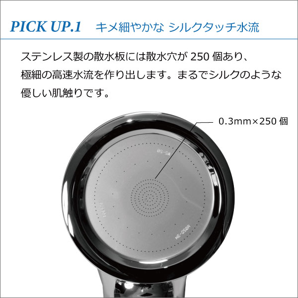 肌あたり滑らかなシルクタッチの水流を作り出すシャワーヘッドです。