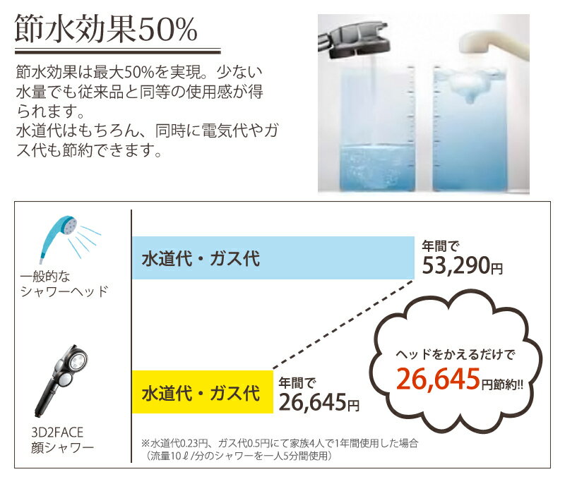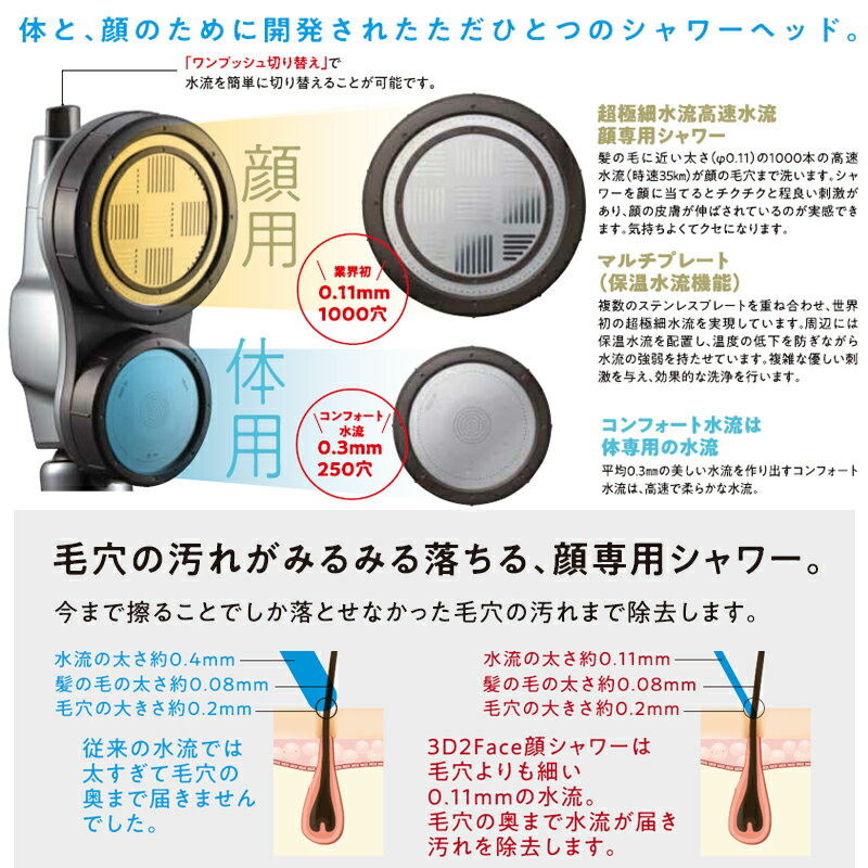 顔専用の水流と体・髪専用の水流、2つの水流で全身を清潔に保ちます ■2ヘッド方式切替方式で2通りの水流を実現 顔用:髪の毛に近い太さ(約0.11mm)の約1,000本の高速水流が顔の毛穴まで洗浄 体・髪用:平均0.3mmのコンフォート水流は高い洗浄力で体を清潔に保ちます ■3D機能(上下48度、左右360度で全身浴に十分な角度) ■節水節ガス効果最大50% ■手元で水をストップできるので便利。