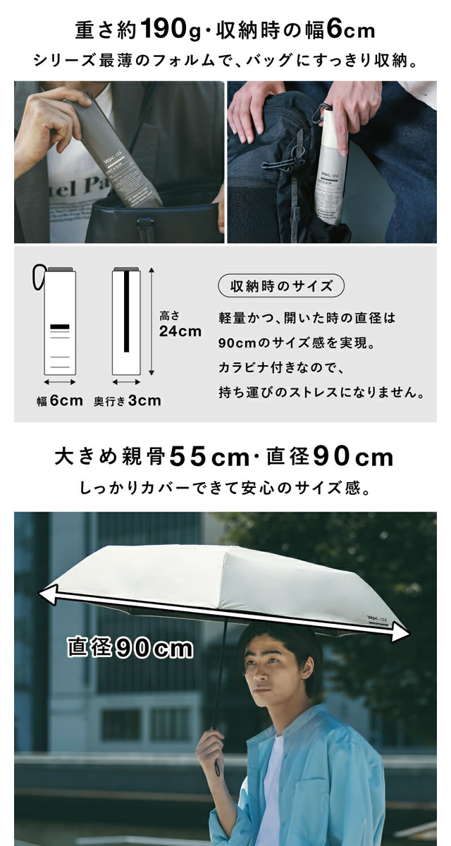 ●【ブランド名】 wpc. (ダブリューピーシー) ●【サイズ】 ・[OneSize]開閉タイプ:手動開閉 ・全長:68cm ・直径:99cm ・親骨:55cm ・ケース収納時(縦×横):43×6cm ・重量:270g ※商品に多少誤差がある場合あり。