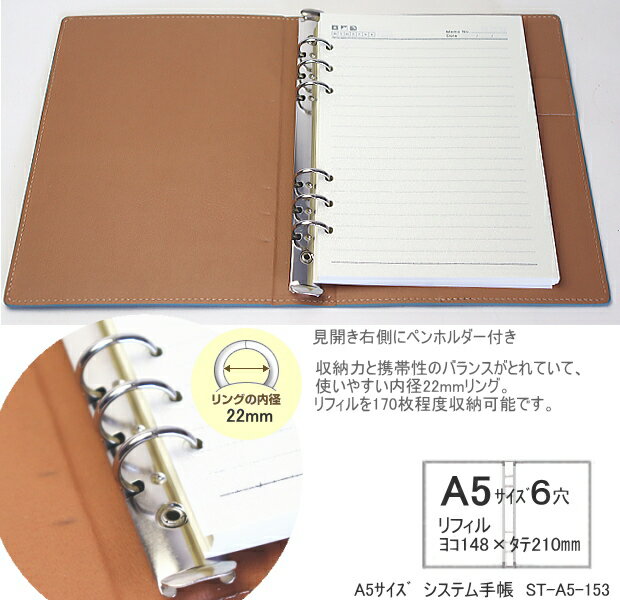 商品名 システム手帳 A5サイズ 品番 ST-A5-153NV ネイビー/ ST-A5-153BK ブラック/ ST-A5-153BR ブラウン サイズ 本体:横165×縦230×厚さ30mm 手帳重量:約)200g 仕様 ※リフィルサイズ:横148×縦210mm (A5サイズ 6穴) リング内径22mm(リフィルを約170枚収納可能) ○リフィル付属(メモリフィルなど) 生産国-中国 素材 合成皮革 メーカー KA-SAM カーサム 年間1000個以上の販売実績をもつマエジム オリジナルブランドKA-SAMのシステム手帳です ※店頭及び他のモールと在庫を共有しておりますので、掲載中の商品でも欠品の場合がございますのであらかじめご了承ください。