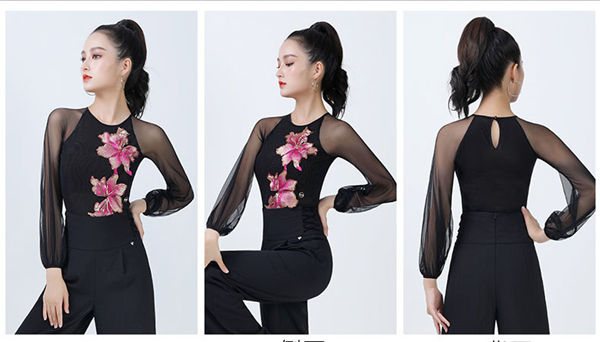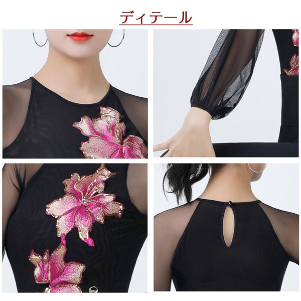 社交ダンス ダンスウェア レオタード レディース 長袖 透け感 ポワン袖 花柄 刺繍 ラウンドネック ラテン モダン チャチャチャ ダンスウェア ダンス衣装 練習着 競技 ダンス大会 レッスン着 レッスンウェア ダンスレオタード ブラック ローズ S M L XL 2XL 3XL
